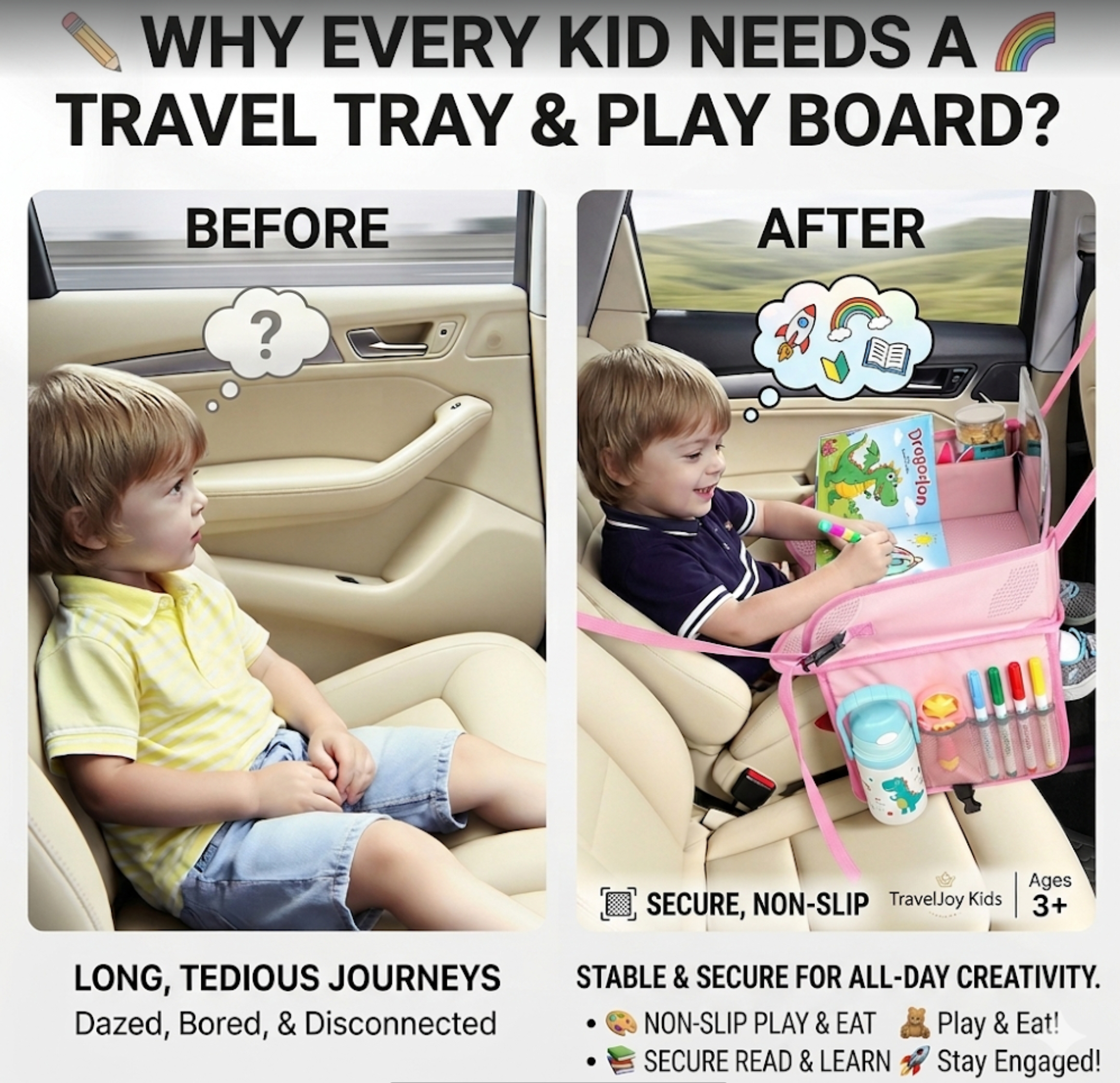 🚀 Banish Travel Boredom: Keep your little ones happily engaged for hours with drawing and playing, turning tedious car rides into joyful creative adventures. 🎒 Wear It Like a Little Bag: Folds up in seconds into a lightweight messenger bag! The adjustable strap lets kids proudly carry their own "mobile play station" over their shoulder. 🛑 Upgraded Silicone Anti-Slip: Features premium silicone particles on the bottom. It grips securely to your child's lap, preventing the tray from sliding around during bumpy rides or sudden stops. 🧽 Waterproof & Mess-Free: Don't worry about juice spills or stray marker lines! The durable, waterproof surface wipes completely clean in seconds with just a damp cloth. 🧸 Smart Storage Pockets: Designed with multiple stretchable mesh pockets to keep crayons, books, toys, and water bottles perfectly organized and right at their fingertips. 🛡️ Kid-Safe & Universal Fit: Made from premium, non-toxic materials with soft collision-proof edges. It easily and securely attaches to any car seat, stroller, or airplane seat.